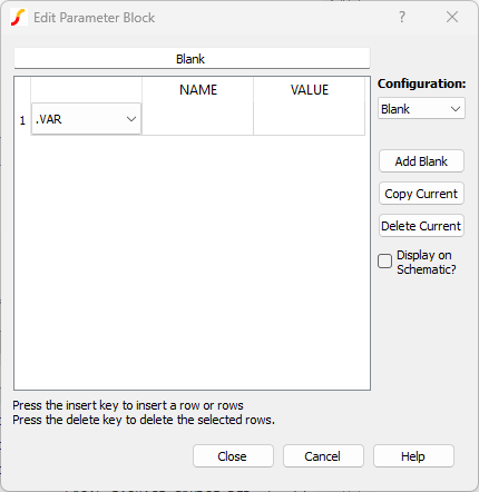 Along with F11 window, parameters and expressions can be placed in a Parameter Block. Unlike the F11 window, a Parameter Block can hold multiple configurations which can be viewed, edited, and saved via the symbol's dialog: