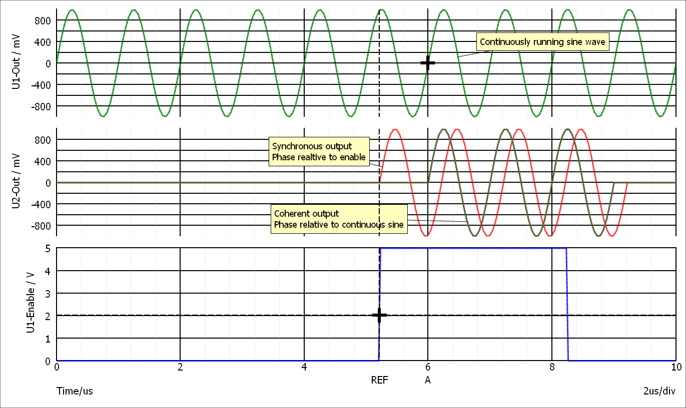 Mode | Coherent or Synchronous. If set to Coherent, the pulse phase is relative to time=0. If set to Synchronous, the pulse phase is relative to the Enable signal. See picture below |